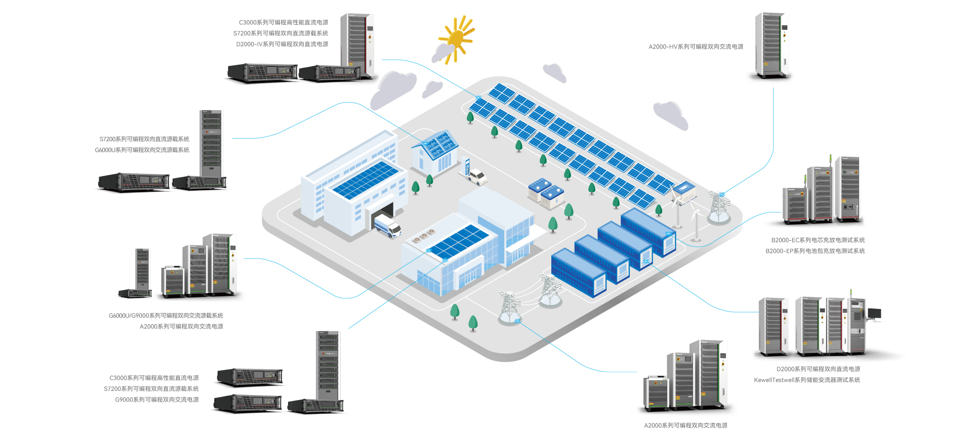 开云电竞光伏测试解决方案支持逆变器发电及并网全天候全场景模拟,匹配大功率/超高压的测试电源模拟大型光伏方阵及电压级别较高的电网端,为光伏客户/测试机构提供专业测试方案。