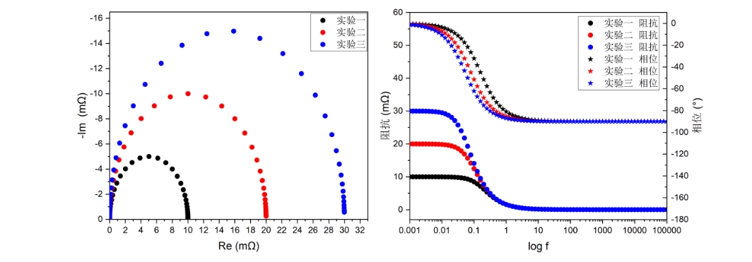 实验一、二、三研究电阻变化对结果的影响,结果如下图所示。左边图形表明,电容和频率相同时候,电阻越大,阻抗模值更大,并且相位差更加靠近电容的区域,这些从基本表达式就可以了解到。