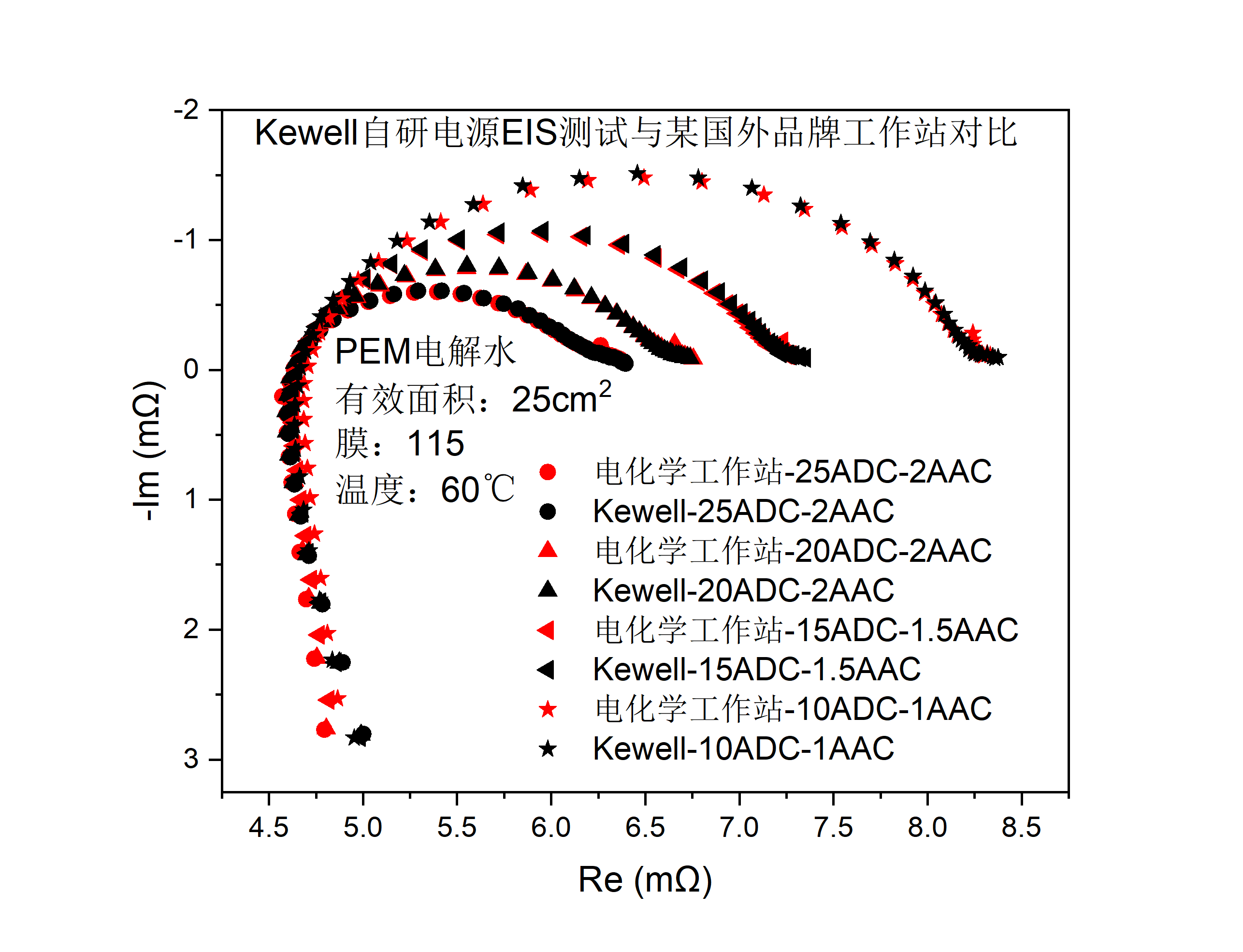 四电极接线方法下,相关产品的测试结果可以与国内外相关电化学工作站测试结果进行对比,见下图。