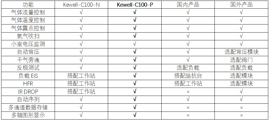 同时,集成后的C100、E500还具备HFR实时监测、断电流内阻实时监测能力,电流电压三角波、方波、线扫等动态工况能力。以有效面积25c㎡ PEM电解水为例,展示其100A运行过程中的断电流内阻监测、HFR监测以及EIS测试结果,以及25A、50A、75A、100A电流下的EIS测试结果。同时对比了新一代燃料电池单池测试台C100-P与前一代产品C100-N及国内外产品标机功能对比表。