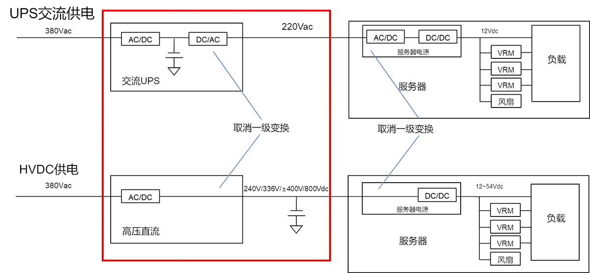 传统交流UPS架构:采用交流不间断电源(UPS)为服务器供电。服务器内部的电源单元(PSU)再将交流电(AC)转换为直流电(DC)供主板、CPU等使用。这种架构存在转换环节多(AC->DC->AC->DC)、效率低(通常90-94.5%)、占地面积大等问题。