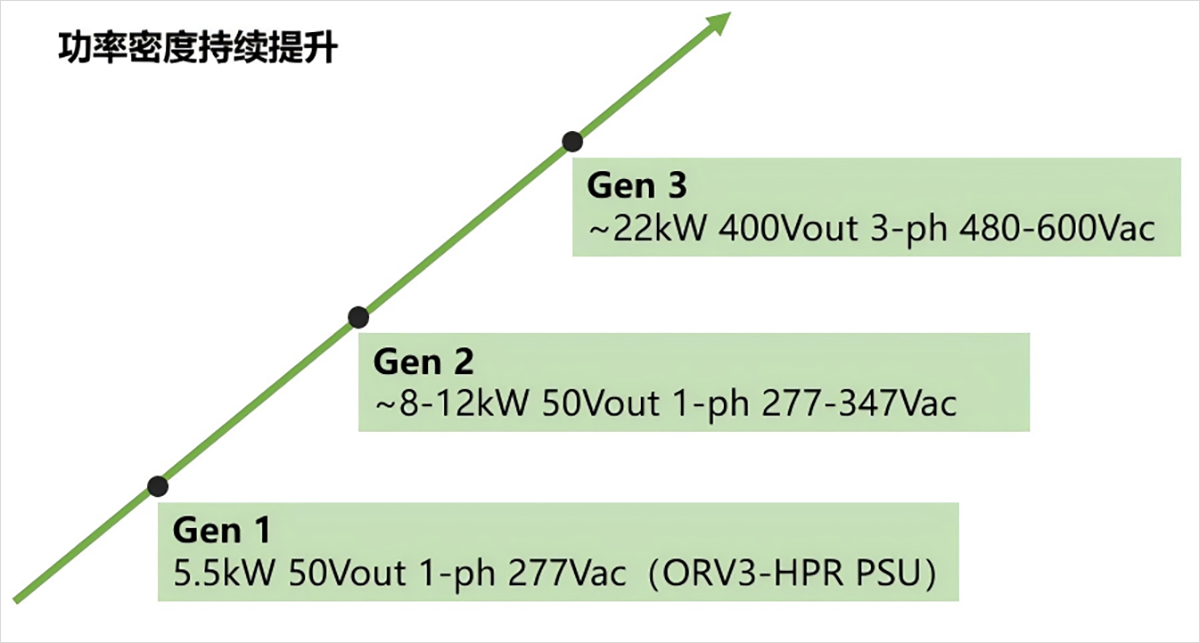 功率密度持续提升:以某头部厂家为例,其PSU升级路线中,PSU架构从3.3kW、5.5kW到12kW、22kW的电源功率进阶,功率密度将从32W/立方英寸提升至100W/立方英寸,核心是通过硅、Sic、GaN等半导体材料提升电源的功率密度,以在有限的空间内提供更高的功率输出。