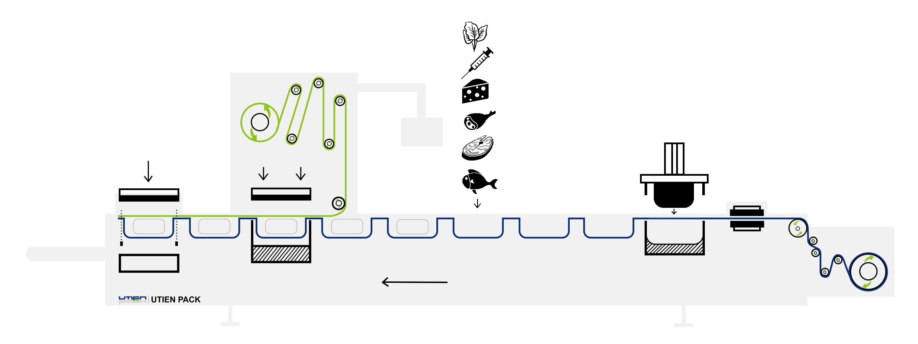 该机采用连续式热成型结构,将刚性膜加热成型为托盒形状,再自动完成产品气调、封口及切割。整机支持与输送、检测、贴标等生产设备联动运行,实现高速稳定的包装生产。